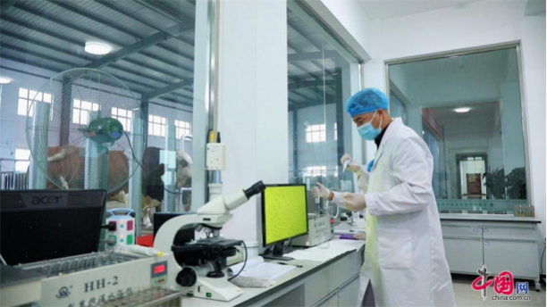 内蒙古中农兴安种牛科技有限公司工作人员制作冻精 (摄影:高旭)